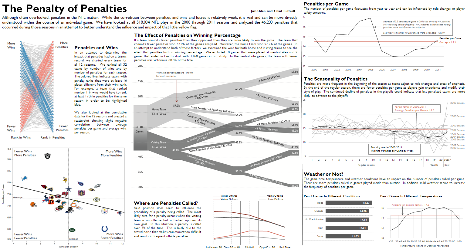 The main story was supposed to be about Penalties and their effect on winning but throughout the course of the exercise, I found other neat ways analyzing the data and tried to include some of them. I thought that the “Where are Penalties Called” was kind of neat as the chart itself sort resembles a football field.