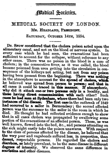 A month after the September 8th removal of the pump handle, Dr. Snow spoke of his views on cholera before the Medical Society of London on October 14, 1854. An account of his talk appeared in the October 21st issue of the The Lancet.