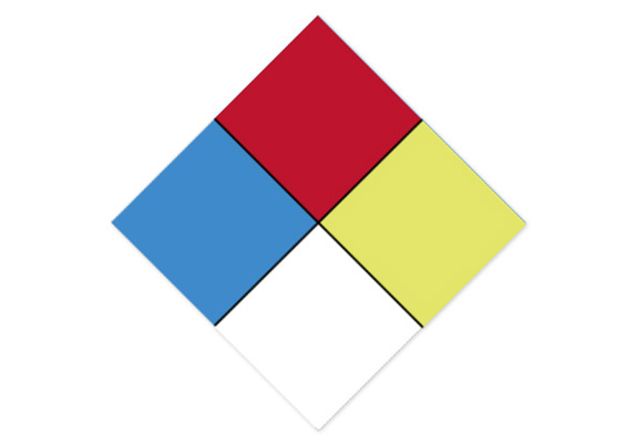 The basic form is familiar to anyone who’s every had some sidewalk chalk and a ball. A diamond divided into four smaller diamonds, each given a color code and number to signify a specific hazard: the blue diamond is the health signal, ranked according to the level of toxicity and effects of exposure to response personnel; the red signifies the level of flammability, and the yellow indicates reactivity. The white diamond is reserved for any other necessary information, such as water reactivity, radioactivity, the need for protective equipment, or specialized extinguishing agents. The number within each diamonds indicates the severity of the threat, ranging from 0, indicating no hazard or unstable materials, to 4, which indicates highly combustible, toxic, or reactive materials that could cause death or major injury.