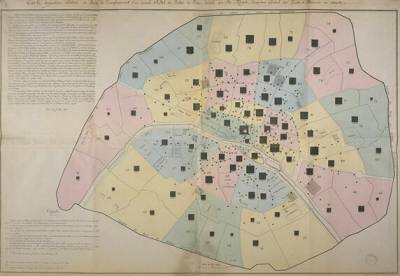 Throughout his later years, and especially after his retirement, Minard continued to study new topics and to invent new graphic forms. He was the first to use pie charts on a map, where he extended Playfair’s use of them (NOTE: more on Mr. Playfair in another blog) to show both the relative proportions (of meats sold in Paris: beef, veal, or mutton) by angular slices, and the total amount of meats by the area of each pie. In 1865, the city of Paris needed to build a new central post office. Minard’s solution was a map showing the population of each arrondisement by squares with area proportional to population, so that the ideal location was their visual and geometric center of gravity.