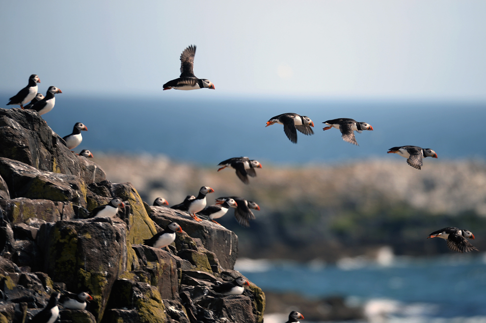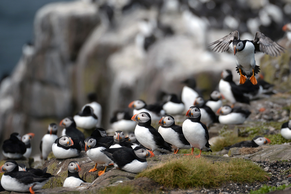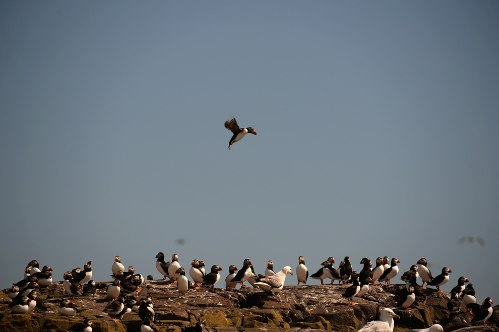 Puffins return to their summer breeding grounds on the Farne Islands on May 16, 2013. According to the National Trust, the last census in 2008 recorded a large drop in the numbers at 36,500 pairs of puffins. In 2003, 55,674 pairs were recorded. (Jeff J Mitchell/Getty Images)
