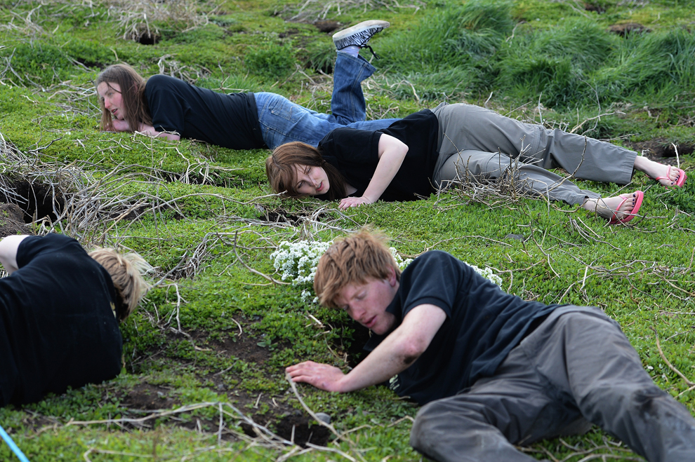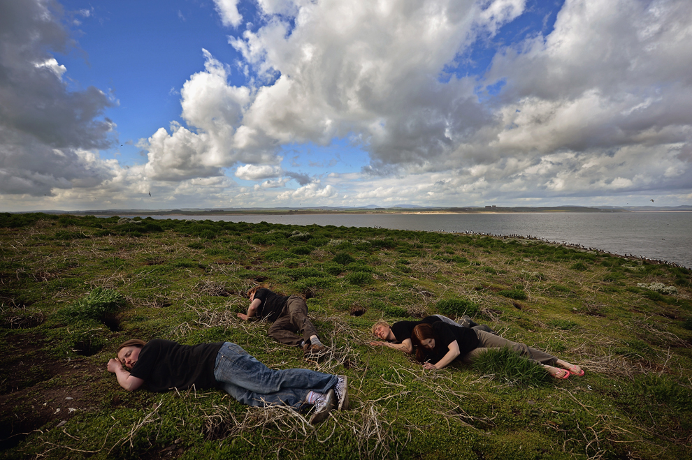 National Trust rangers Will Scott, David Kinchin Smith, Samantha Morgan and Laura Shearer put their hands into puffin burrows to check for nests during a census on the Farne Islands on May 16, 2013. A census is carried out every five years.(Jeff J Mitchell/Getty Images)