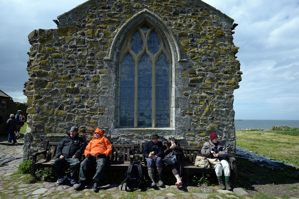 Members of the public sit in front of the Chapel of St Cuthbert on Farne Islands where puffins are returning to their summer breeding grounds on May 16, 2013.(Jeff J Mitchell/Getty Images)
