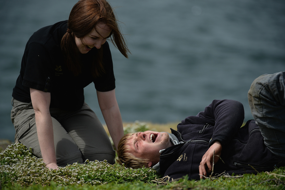 National Trust rangers Will Scott and Samantha Morgan laugh as they put their hands into puffin burrows during the census. Puffins nest underground, so this is the only way to tell if it is occupied. (Jeff J Mitchell/Getty Images)
