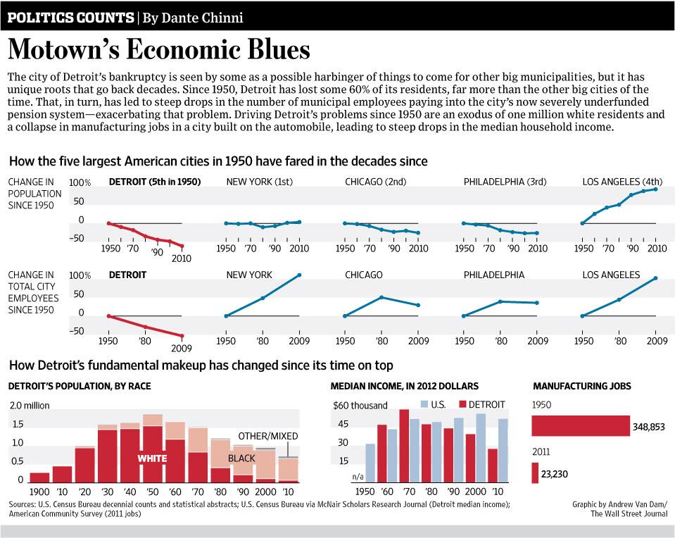 Note: I just wanted to let you know I am going to occasionally post interesting graphics from The Wall Street Journal under the title “WSJ DataViz.” This week’s entry is about the sad affair that is going on in my hometown of Detroit. Crazy “solutions” are being tossed around like selling the art in the Detroit Institute of Art Museum to selling the Howdy Doody original puppet from its famous puppet collection. Greed and corruption brought it down. The great culture and heritage of this city should not suffer for these politicians sins.