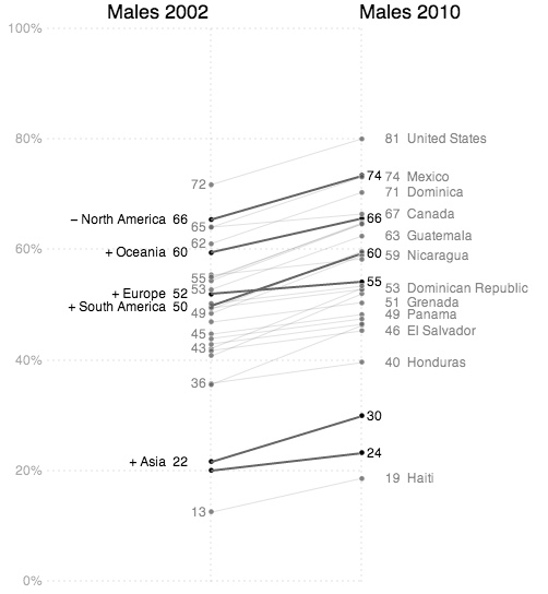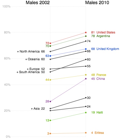This first image below shows the trend for male obesity organized by continent. It’s a difficult problem to show labels for so many countries along one axis so Mr. Clark tried to alleviate it by letting the user expand or hide countries by continent group. In this case ‘North America’ is expanded to show its’ individual countries. Labels are only shown if they don’t overlap with others. The largest countries by population are placed first.