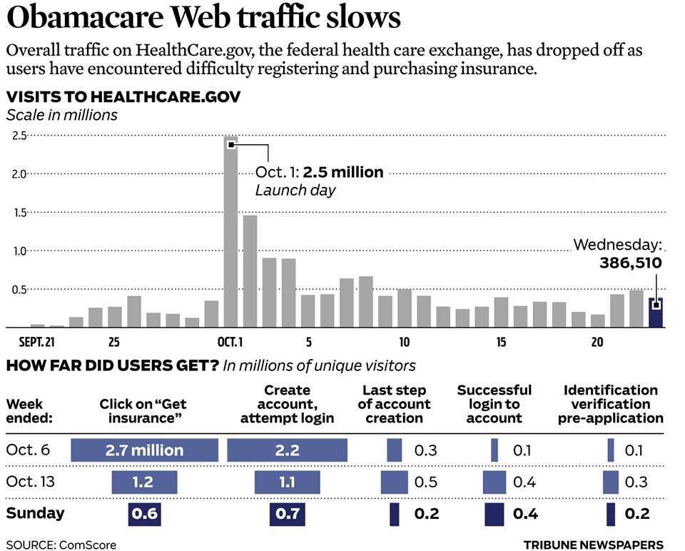Traffic to healthcare.gov, the federal health insurance exchange, has dropped off significantly since consumers began encountering problems with the site after it launched on Oct. 1. The Chicago Tribune Graphics Department created this data visualization to show the effects of the slowdown through Wednesday, October 23rd, 2013.