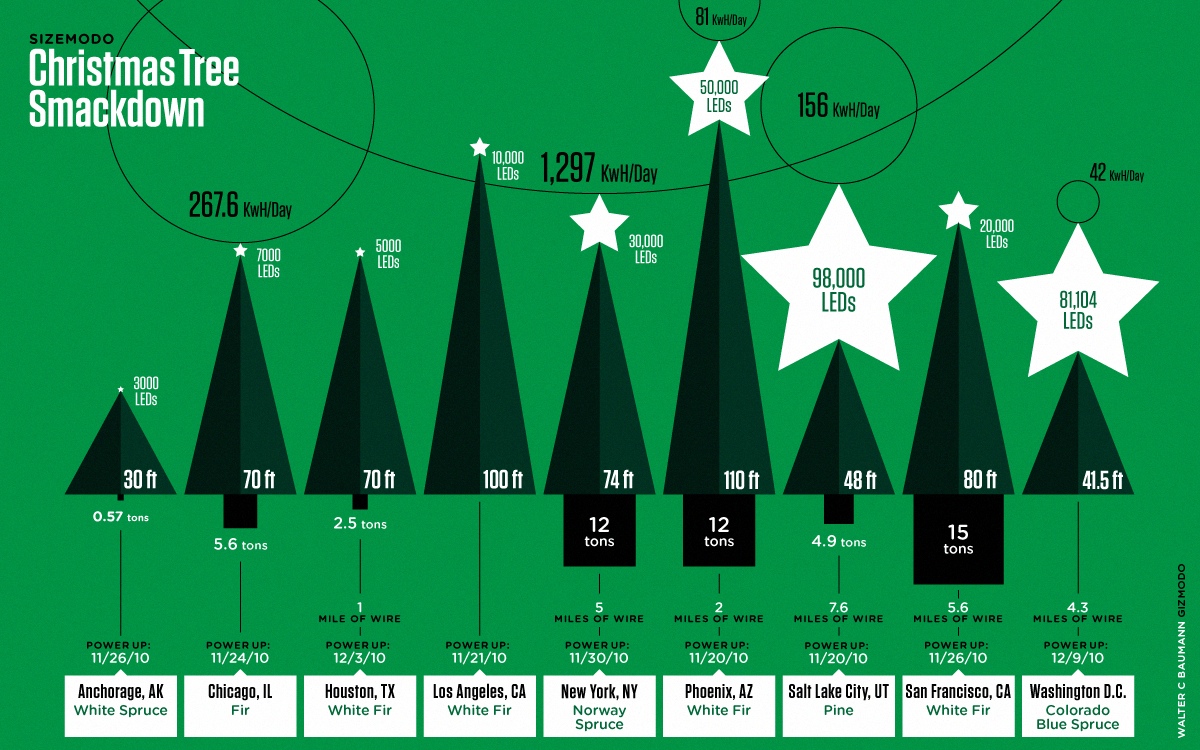 If you’re looking for the tallest tree in America, visit Phoenix. Looking for the heaviest? Hitch a ride on over to San Francisco. Well surely, the brightest tree must be in the Big Apple, right? Nuh uh: Salt Lake City. In fact, despite its undeniably awesomeness, the only superlative that New York’s Norway Spruce can rightfully own is that it uses the most electricity. Click on the image below for a supersized, super-in-depth view of the Nation’s most favored pines.