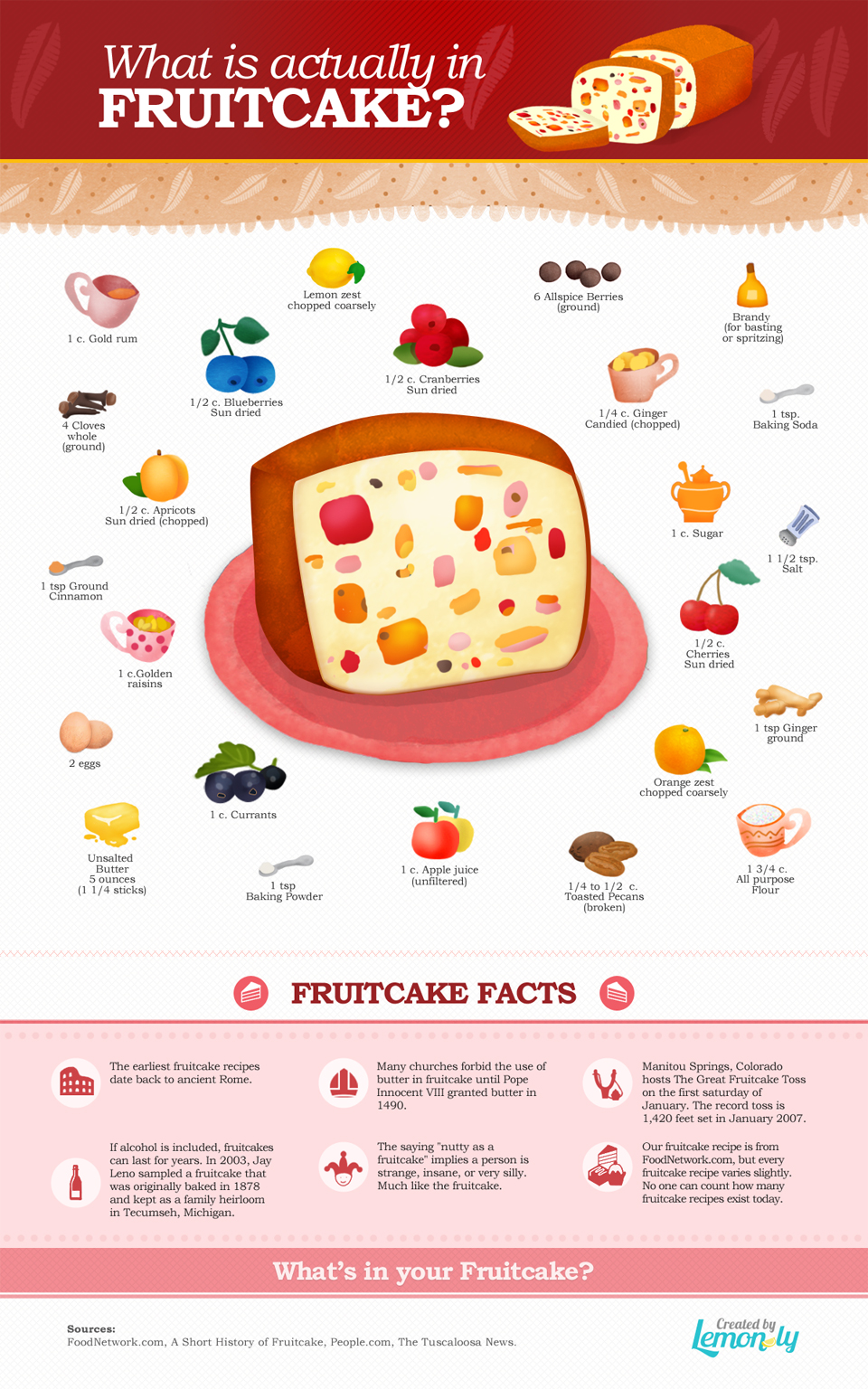 Fruitcake has been a Christmas staple for decades. And it has been a mystery to people for just as long. The age-old question surrounding fruitcake is always, “Just what is it that I’m actually eating…?” In the spirit of Christmas and holiday traditions, I found this infographic by lemonly.com that dissects the fruitcake. We know there are lots of fruitcake recipes out there, but here is just one example of all the ingredients that can go into the elusive Christmas “treat.” Grab a fork and dive in, everyone! Let them eat (fruit)cake!