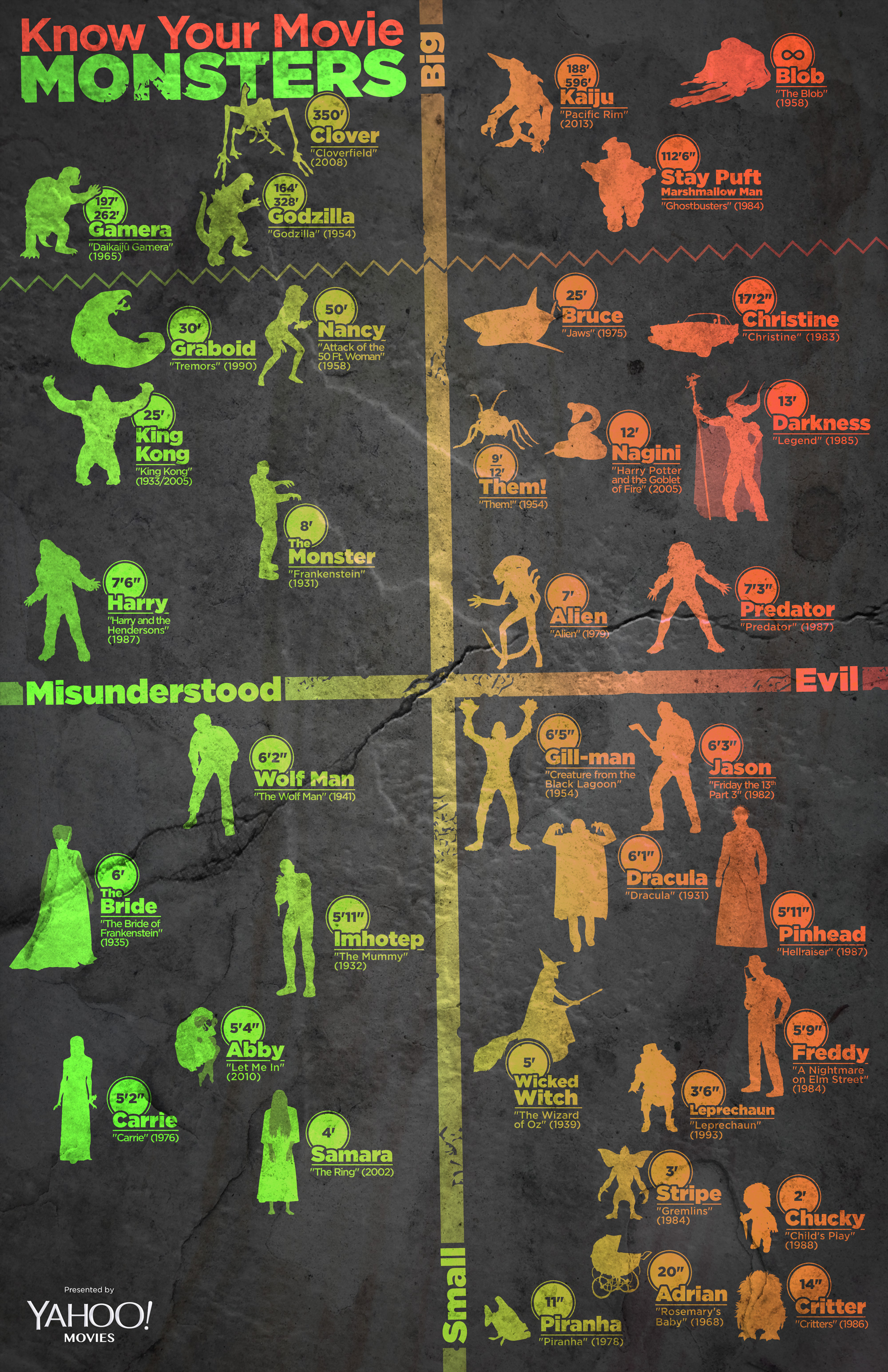 Yahoo! Movies created an infographic where they classified their favorite movie monsters, plotting out in chart form how big and how evil each one is in relation to each other. Take a look at how the monsters match up.