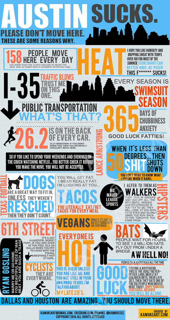 Russel, a graphic designer, admits humor was the basis of her new “Austin Sucks” infographic that’s been making the rounds on social networks around Austin— scroll down the page to see the image. The 26-year-old got the inspiration for the image last week when a graphic from Complete Web Resources laying out reasons why Austin was an attractive destination made the rounds online.