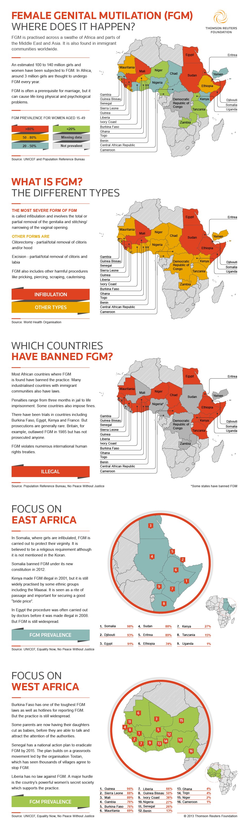 Every year, around 3 million girls undergo female genital mutilation (FGM) in Africa alone. It is also practiced in pockets of the Middle East and Asia. FGM, which involves the removal of external genitalia, can cause serious physical and emotional damage, and even death. It is generally performed by traditional cutters, using anything from ancestral knives to razor blades and tin can lids.The infographic below outlines where this practice occurs the most.