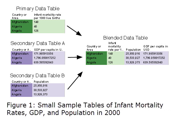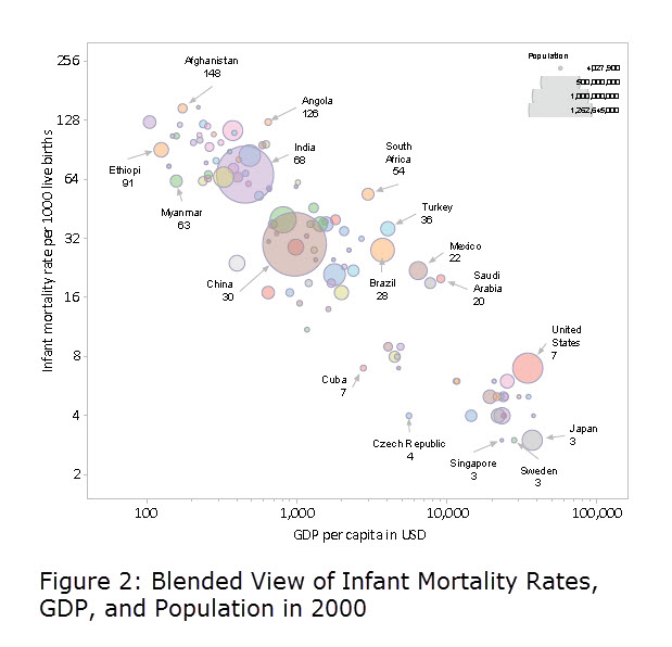 In this section we will discuss a scenario in which three unique data sources (see left half of Figure 1 below for sample tables) are blended together to create the visualization shown in Figure 2 below. This is a simple, yet compelling mashup of three unique measures that tells an interesting story about the complexities of global infant mortality rates in the year 2000.
