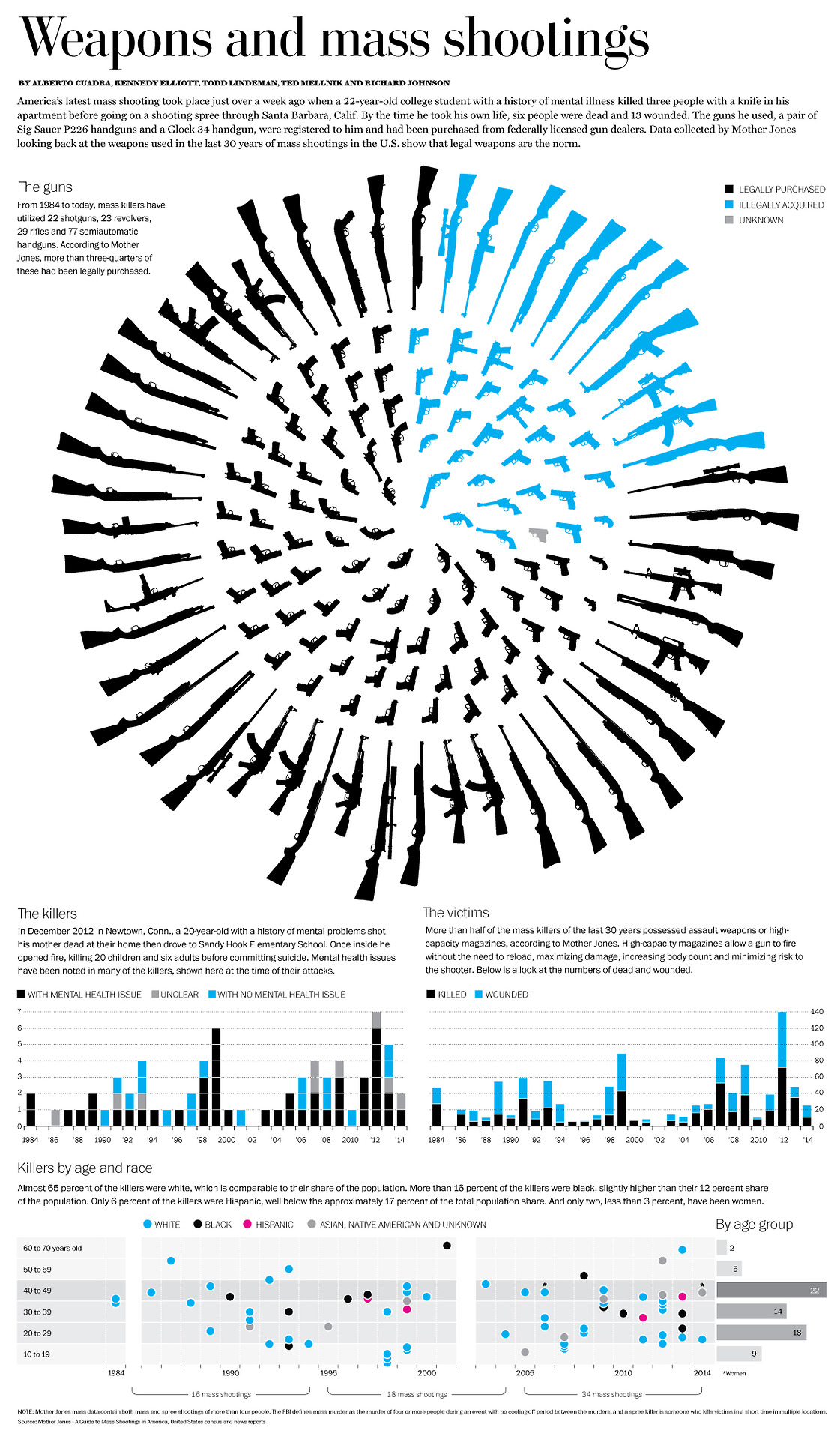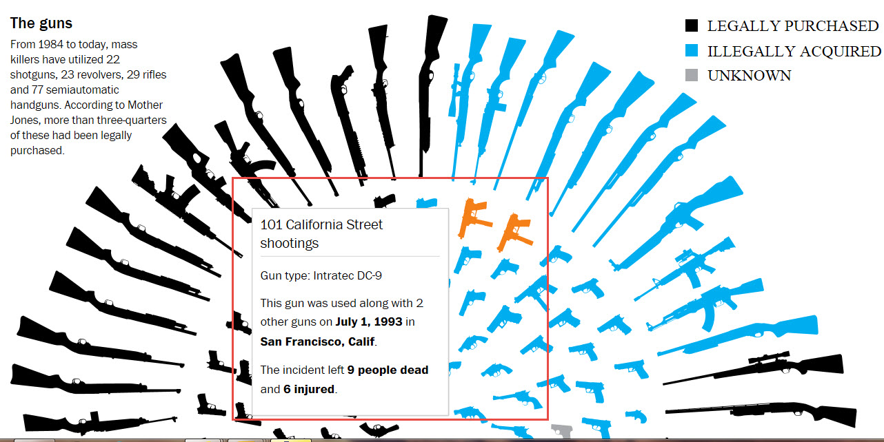 I’d like to say this one was quick but it would be a lie. This one took all week to sort through all of the fantastic data collected by Mother Jones and then update it with the last two years data. The key point that struck us, that we attempted to highlight in the top graphic, was the somewhat surprising percentage of legally purchased firearms used. Then we dug a little deeper and looked at the killers with known mental issues. The victims. Then a look at race and age of the killers. Two artists drawing all the weapons and a data nerd and a programmer for the web version. Three days. In Monday’s Washington Post, probably, maybe.