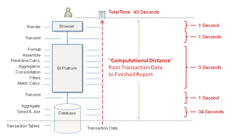 The longer the computational distance is for a given report, the longer it will take to execute and render. The preceding image shows a hypothetical example of a report that runs in 40 seconds. Each processing step on that report, such as aggregation, formatting, and rendering, adds to the report’s computational distance, increasing the report overall execution time.