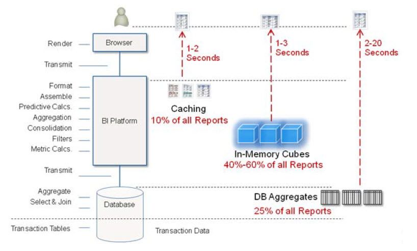 Computation distance offers a useful framework from a performance optimization perspective because it tells us that to improve the performance of a report or dashboard, you must focus on reducing its overall computational distance. The following image shows different techniques such as caching, cubes, and aggregation that can be used to optimize performance for the 40 second hypothetical report.