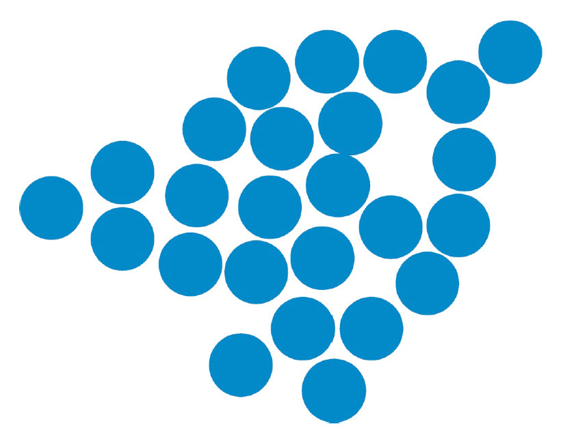 The visualization below, shows the same number of circles, however, is well designed for the counting task. Because the circles are grouped into small sets of five each, it is easy to remember which groups have and have not been counted, easy to quickly count the number of circles in each group, and easy to discover with little effort that each of the five groups contains the same number of circles (i.e., five), resulting in a total count of 25 circles.