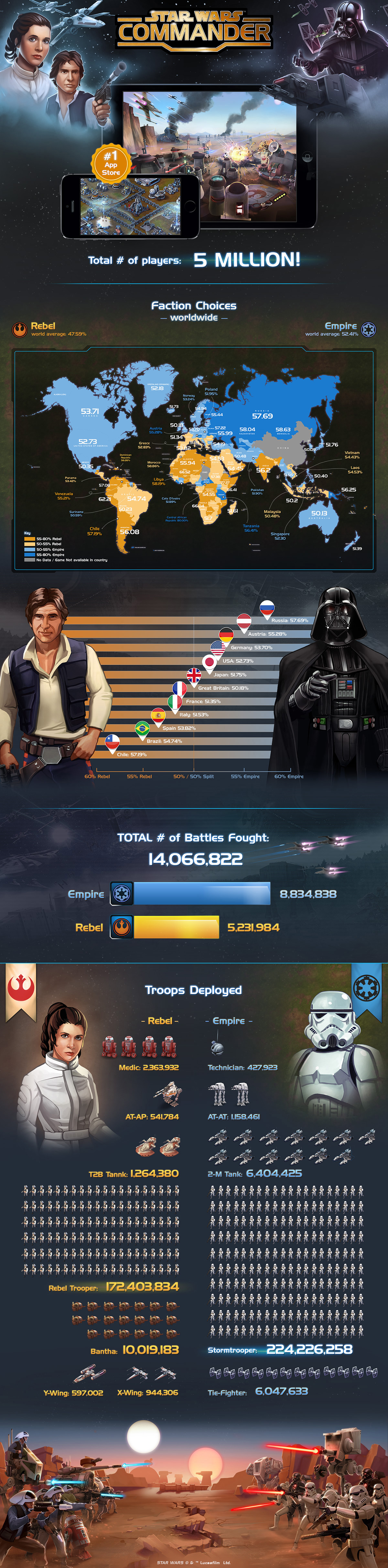 Are you playing, Disney’s Star Wars: Commander mobile game? No? You might soon be in the minority. According to Disney Interactive, the game has now been downloaded five million times since it launched on August 21. To celebrate this milestone, they created the rather cool infographic below to give you a look at what percentage of gamers choose to play as the evil Empire versus the Rebel Alliance and how that varies country to country.