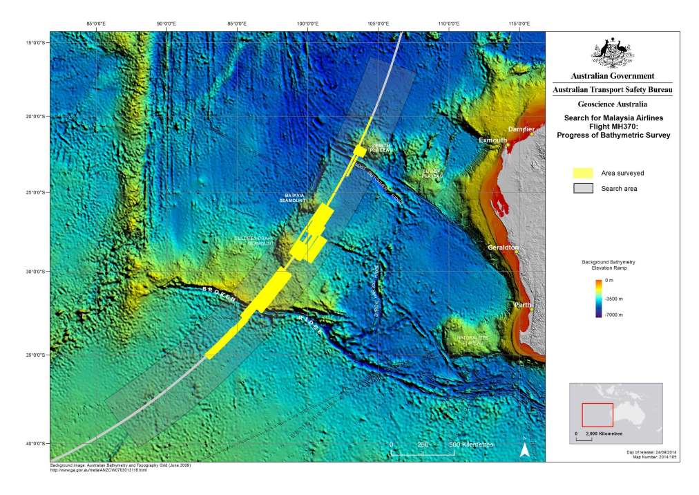 In this map provided on Sept. 24, 2014, by The Australian Transport Safety Bureau, details are presented in the search for the missing Malaysia Airlines Flight 370 in the southern Indian Ocean. After a four-month hiatus, the hunt for Malaysia Airlines Flight 370 is expected to resume Sunday, Oct. 5, 2014, in a desolate stretch of the Indian Ocean, with searchers lowering new equipment deep beneath the waves in a bid to finally solve one of the world’s most perplexing aviation mysteries.
