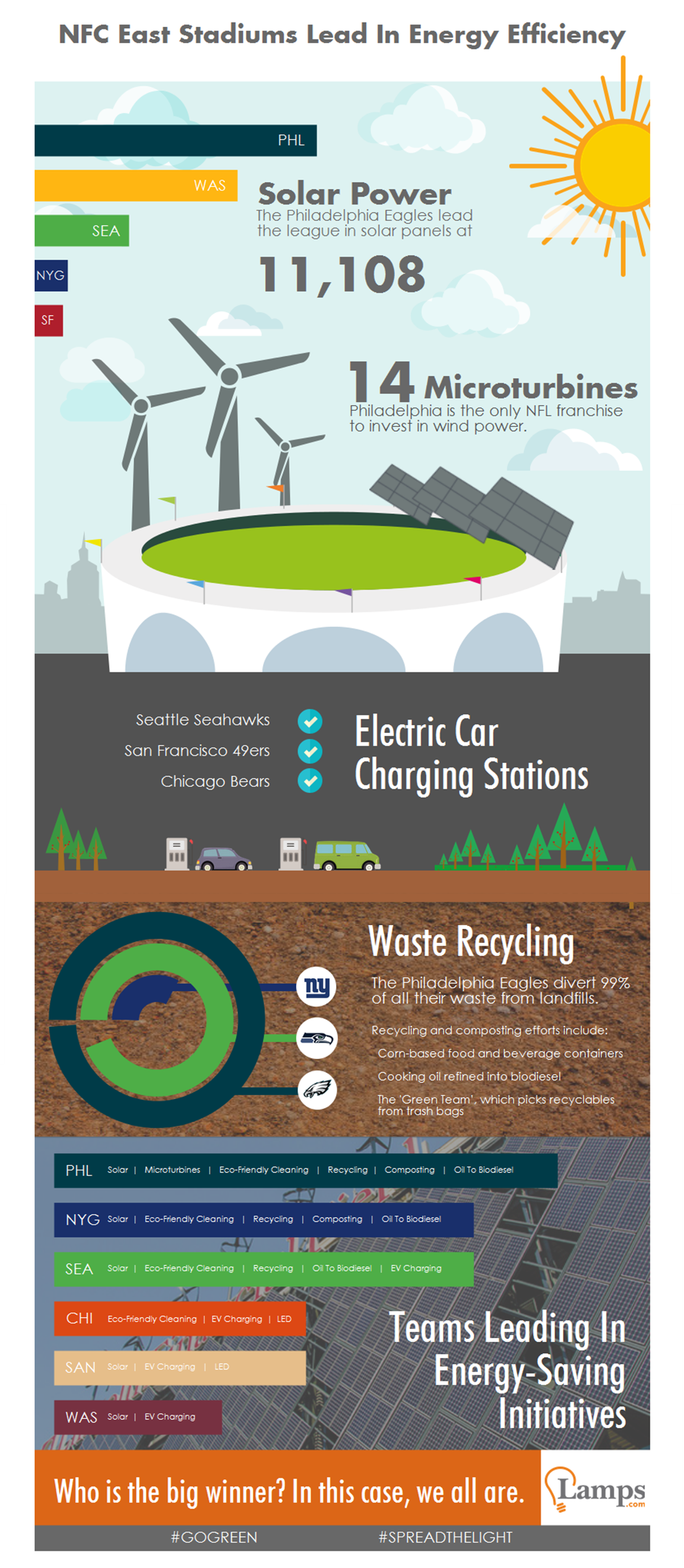 October is not only a time when the NFL football season swings into full gear, but also National Energy Awareness Month. There are actually significant parallels between the two, as more and more NFL teams have taken important strides in energy conservation within their stadiums. In honor of this important month, Lamps.com decided to combine these passions – Energy Conservation and the National Football League – into a helpful infographic. As you will see, the Philadelphia Eagles (ironically Lamps.com’s hometown team) seem to have the most green stadium and appear to be the most energy-conscious NFL franchise.