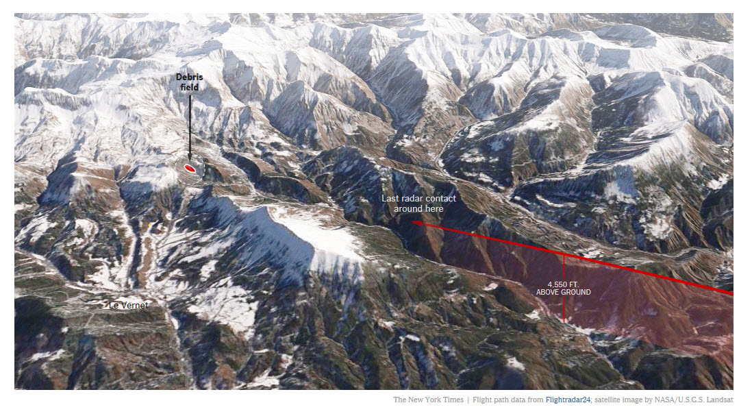 The plane went down in a remote part of the Alpes-de-Haute-Provence department, and search teams struggled to get to the area. When French air traffic controllers lost contact with the aircraft, it was flying at approximately 6,000 feet; the elevations in the search area range between 2,000 and 9,000 feet.