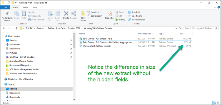 At the end of Part 2, we created a new .TDE file without the hidden fields and rename it to “Hide Fields – Aggregation” in my sub-folder (see screenshot below). Notice it was 1,732 KB (kilobytes or 1.73 MB) in size. Remember: The smaller the size of the extract file, the better our performance will be.