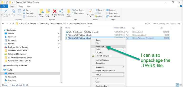 - On a Windows computer, right-click the packaged workbook file (.twbx) in Windows Explorer and select Unpackage.