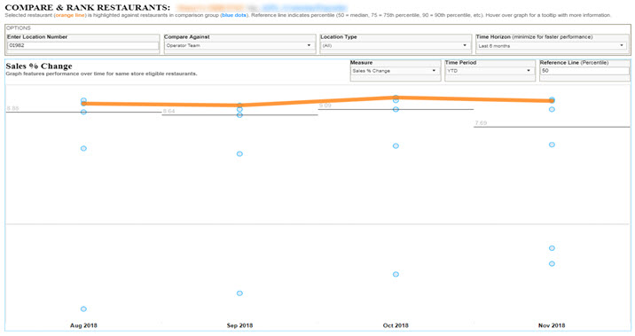 Here’s the scenario… Have you ever wanted to create a view like the one below that allows users to select a specific location (in this case, a restaurant) and compare that location against a relevant peer group (in this case, that restaurant’s Service Team)?