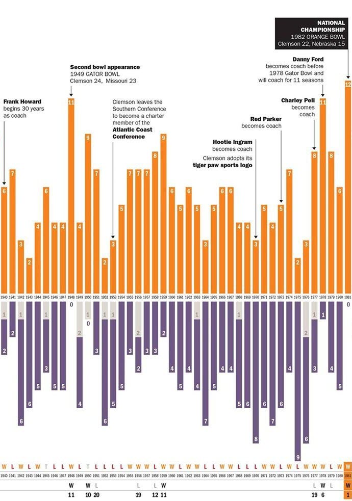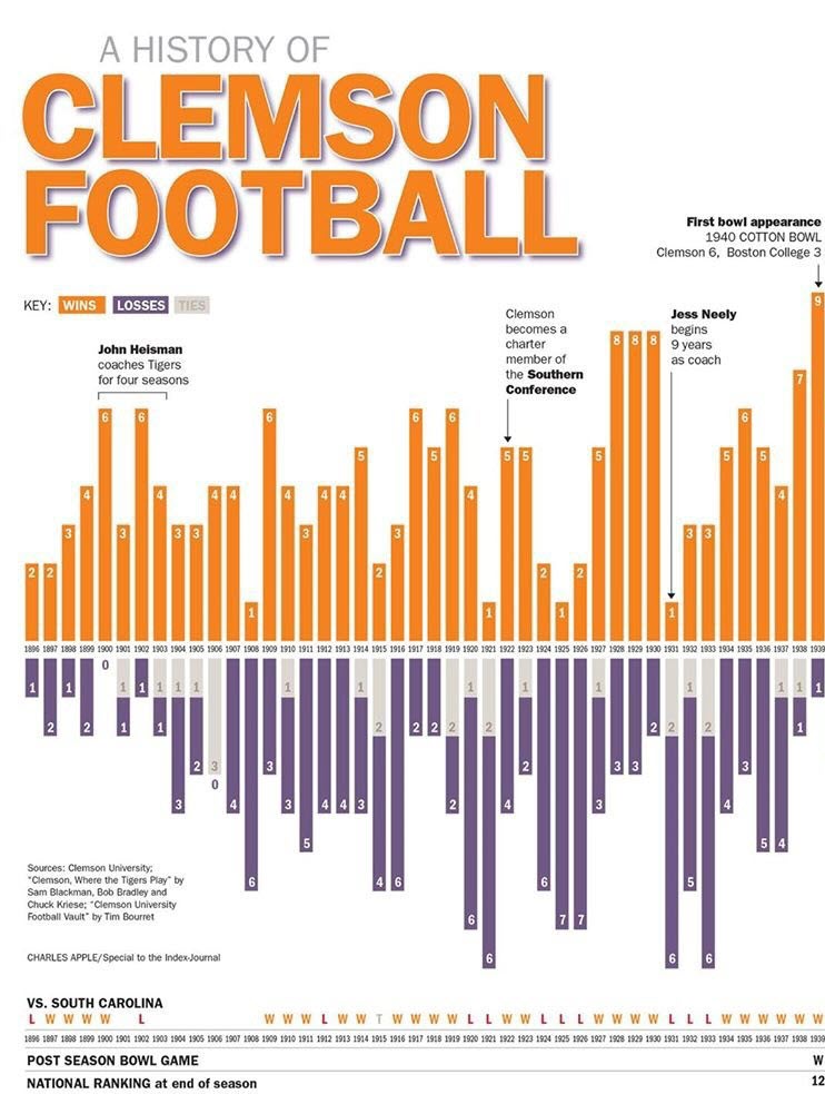 Charles is a big Clemson football fan and created a great infographic titled A History of Clemson Football. I have included the infographic as one complete view. Then, I broke the infographic into three larger sequential pieces so you can view it better.