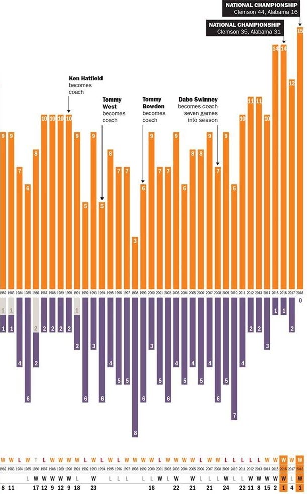 This was a bit of an afterthought — I probably should have finished it earlier and I probably should have tried to market it to more papers. This shows Clemson football wins, losses, national rankings and national championships going back to the start of their program in 1896. My pals “back home” at the Greenwood (S.C.) Index-Journal were kind enough to give this one a home.