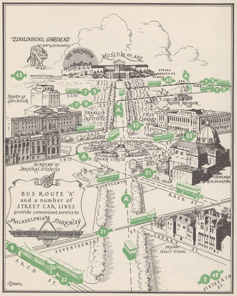 Historical Map – Bus and Streetcar Lines on the Benjamin Franklin Parkway, Philadelphia, c. 1935