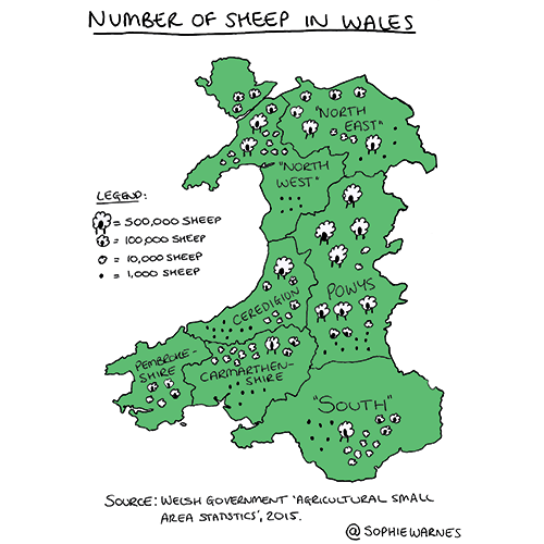 The idea for this came from one of my first editions of my newsletter Fair Warning. I had included a map of Australia (here) that had shaded areas to show sheep and wheat, and bits of it were marked “no sheep” and “some sheep” – it just made me laugh. Someone suggested I do one for Wales so that’s where this one came from.