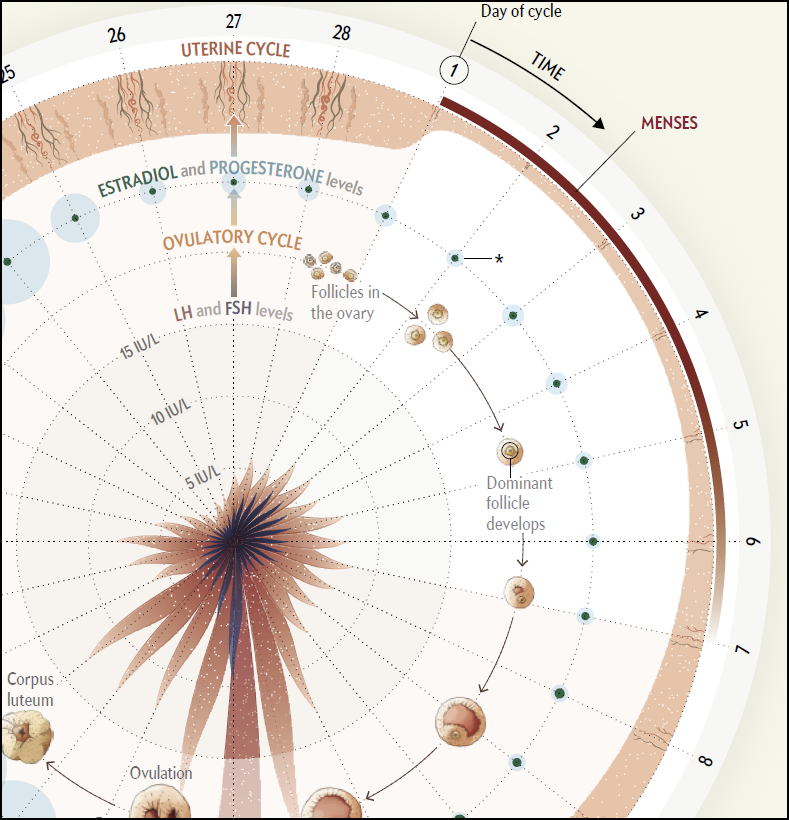 I wanted to share one of the data visualizations from her article depicting the menstrual cycle. The dataviz shows time (28 days), thickness of the uterine endometrial lining, concentration of hormones released by the ovaries, the ovulatory cycle, and concentration of hormones that stimulate the ovaries over the 28 day cycle.