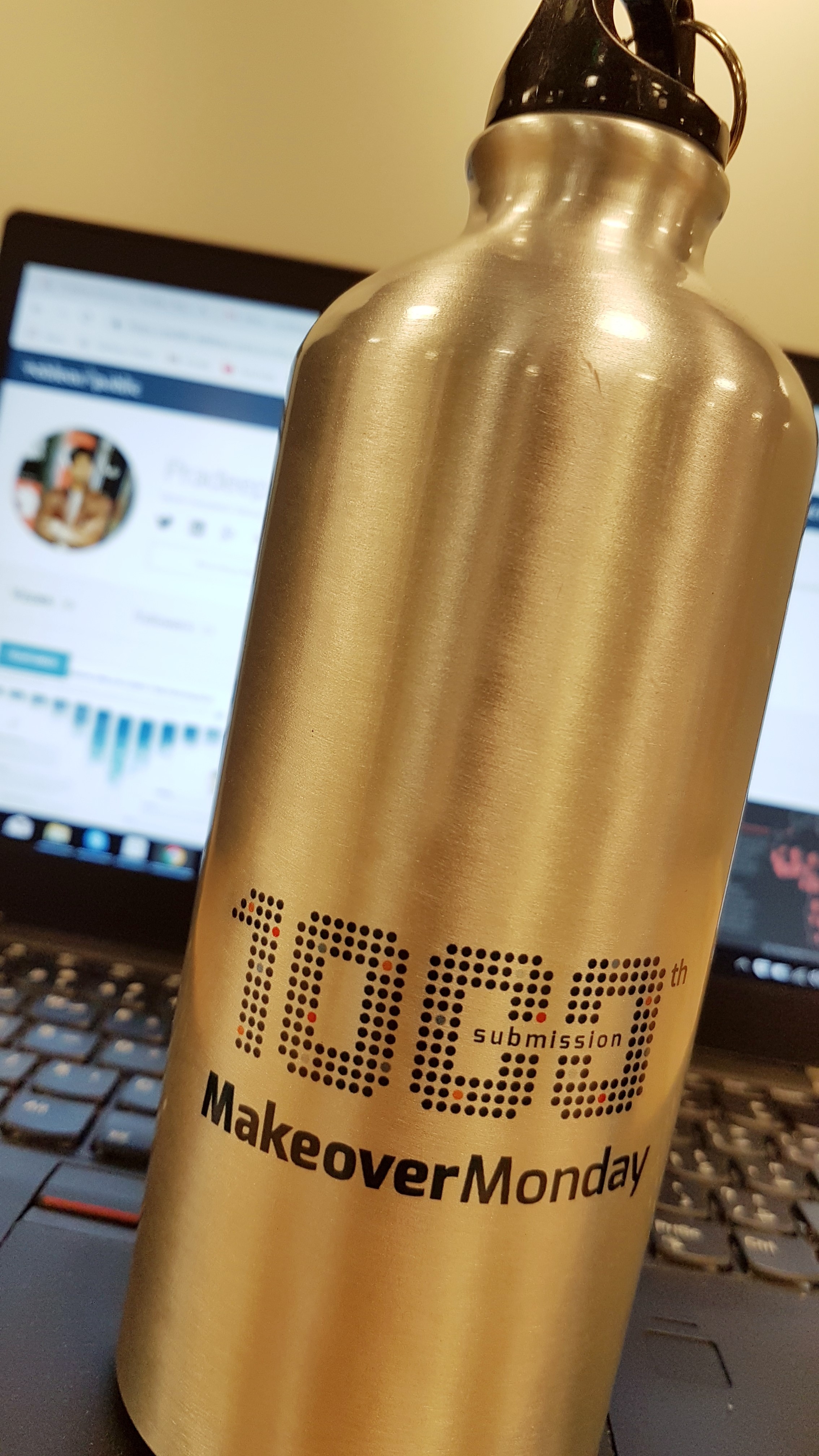 I frequently participate in #MakeoverMonday Project by Andy Kriebel (@VizWizBI) and Eva Murray (@TriMyData) which helps me to shape up my data analysis and data vizualisation skills. (I was lucky enough to get a swag (water bottle) from #MoM for 1000th submission, which gave me a lifetime memento) https://twitter.com/VizWizBI/status/1090659140765208576