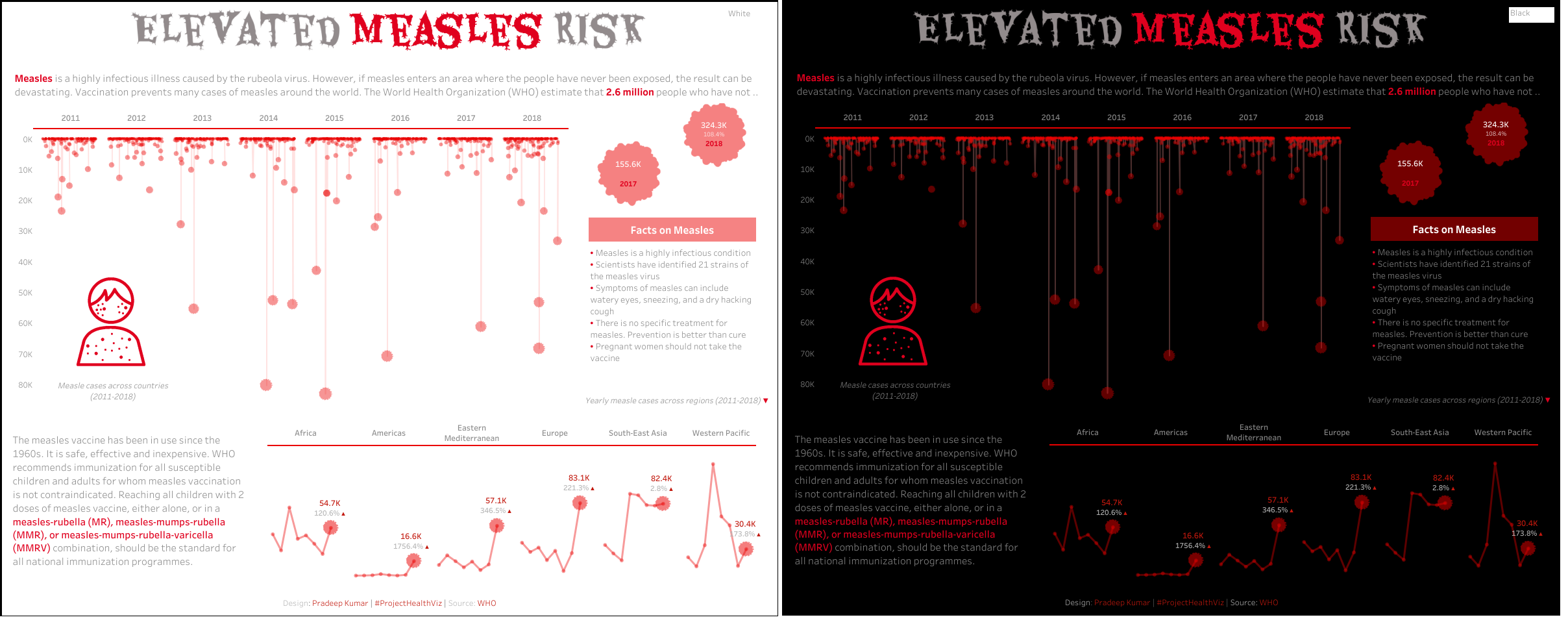 Inspired by his work, I have come up achieving the same trick using single sheet and parameter in my viz “Elevated Measles Risk”, a #ProjectHealthViz (Topic- Measles) by Lindsay Betzendahl (@ZenDollData)