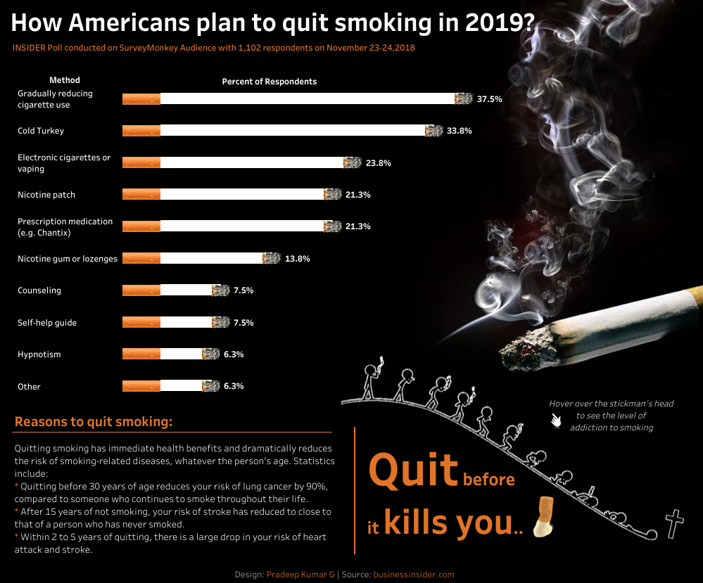 Pradeep: Yes, I still remember the time when I have created the viz related to smoking issue. Last December 2018, I have read an article in Insider.com about “How Americans plan to quit smoking in 2019?”. This topic really attracted me and I just wanted to convey this topic in an interesting way using Tableau. So, I decided to use cigarettes as bars.