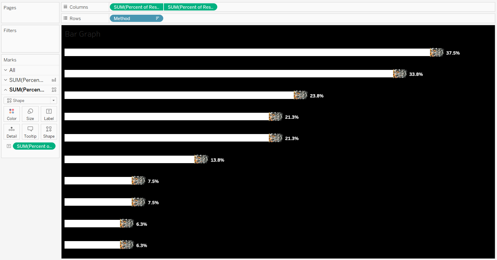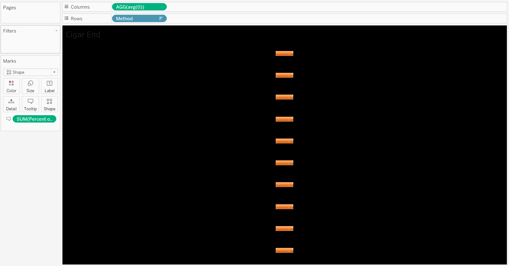 It was really fun creating this viz and it was simple to create, as well. As most of the tableau people knows that we can add an image/shape at the end of the bar using dual axis. I used the same trick. I made white horizontal bar chart and added cigarette ash (shape) at the end of each bar. I created the ‘cigar end’ (shape) for bars in a separate sheet and then I just placed both the sheets side by side inside a container 😊