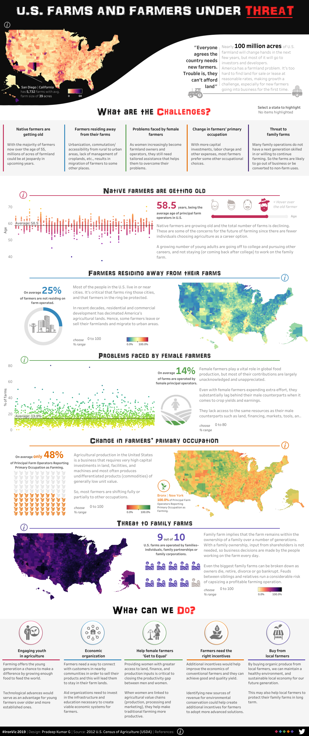 Michael: Hello Pradeep. You recently posted your IronViz 2019 submission on Tableau Public. It is titled U.S. Farms and Farmers Under Threat.