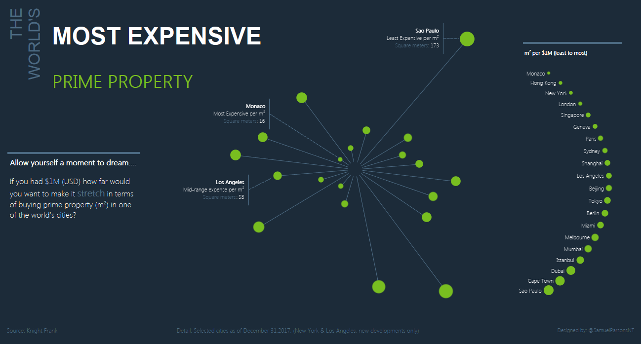 Sadly though, even with the training sessions Joe delivered. I wasn’t able to use Tableau in my day job, I had Excel work that was too critical to stop doing. So I took to learning and developing my skills at home in the evenings. I posted my first viz in March 18 and by May 18 I had my first Viz of the Day (VOTD)! I was a bit of a gift, its one of the simplest VOTD’s you will see, but it was from #MakeoverMonday and about The World’s Most Expensive Prime Property – how many square feet could you afford in different cities around the world for $100M. That though, was the kick that made me think, maybe I can do this and be good at it?