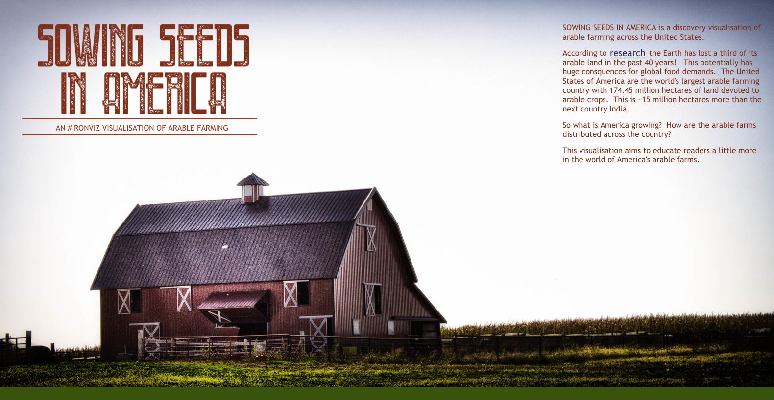 Michael: Hello Sam. You recently posted your IronViz 2019 submission on Tableau Public. It is titled Sowing Seeds in America. [NOTE: These questions were submitted to Sam prior to him being selected as second place in the Global IronViz Feeder 1 – Agriculture].