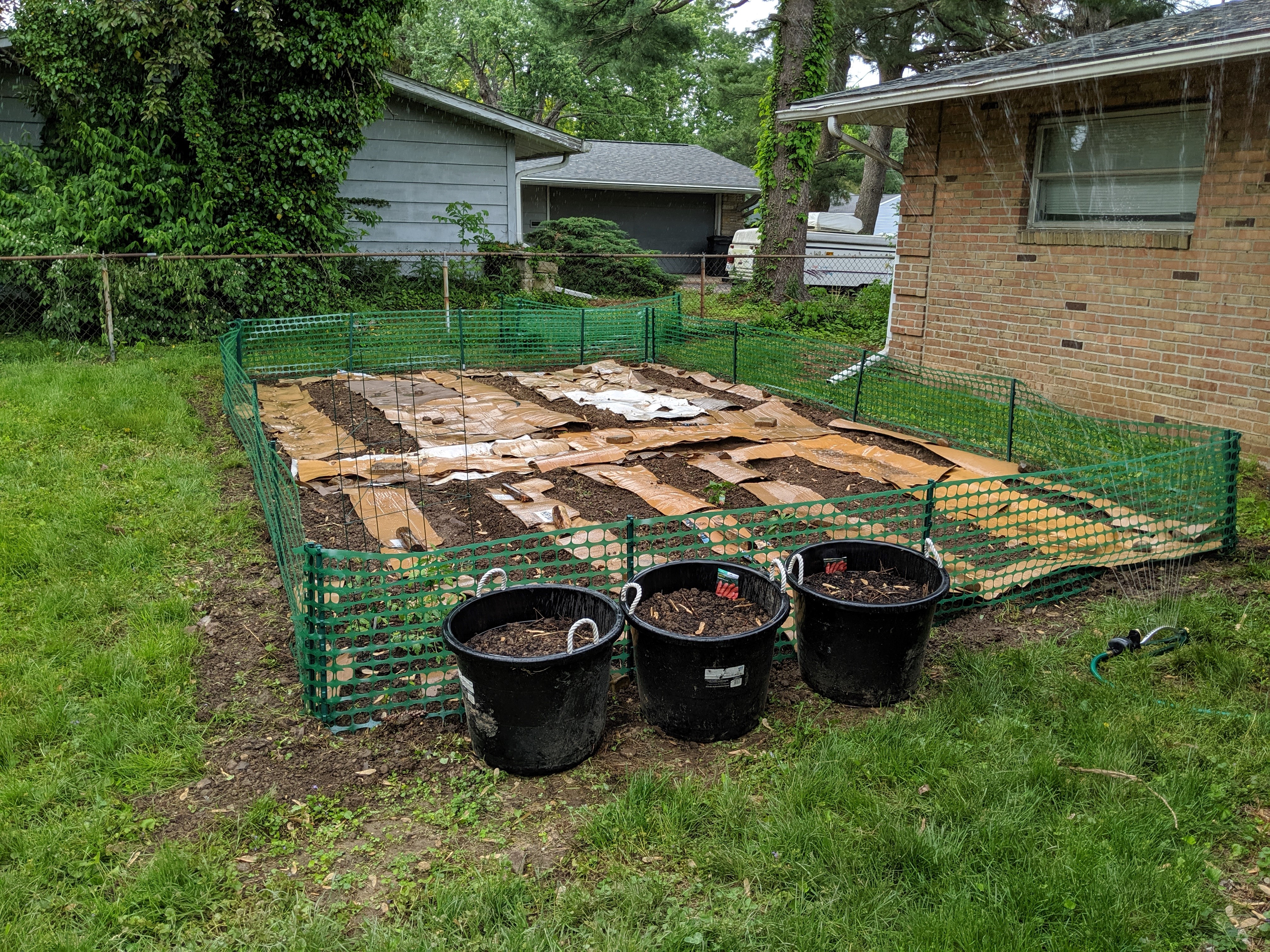 The buckets you see is the next part, for carrots and sweet potatoes. I don’t care to till super deep for root vegetables, so we use buckets (make sure to drill holes to draining!). It’s a bit tricky to find enough top soil without scalping my yard, but those buckets will give us a lot of heavier veggies.