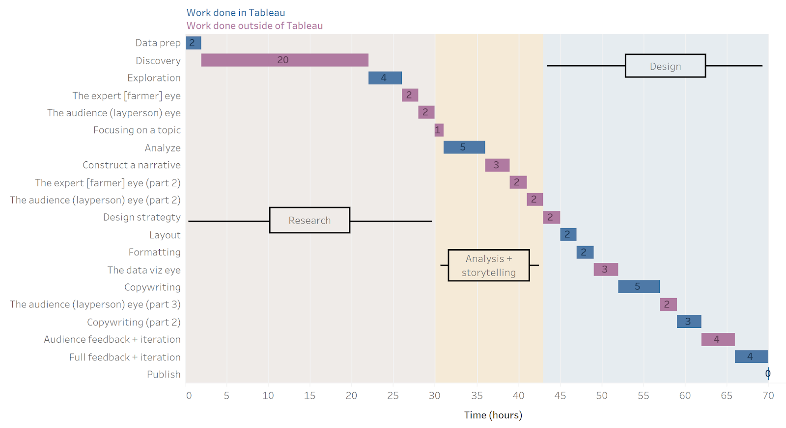 After going through several iterations, you ended up with a three phase, 21 step process to create your IronViz entry as you visualized in the screenshot below.
