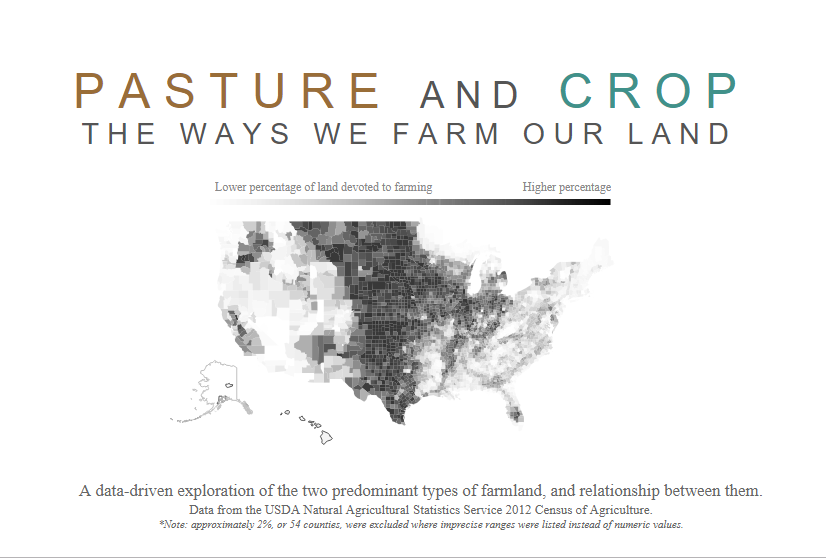 I found that some of my assumptions about crop rotation were flawed. Growing up in a rural school, crop rotation was actually part of our curriculum. However, I assumed crop rotation was a year-over-year thing, but I found out that a lot of crop rotation happens within a year. Also, I assumed livestock farmers that grew their own crops were devoting it to their livestock (as hay), but another friend told me that a common practice is to harvest and sell the head as grains, and to keep the stalks as straw for bedding (while keeping some of the grains as protein supplements for their livestock). I also learned a lot about farming families which made me incredibly distrustful about the demographic data, e.g., farmers living away from their farms; often that’s because families will spread out away from the farm, but still live relatively close: For example, my one friend has an entire road named after his family. Only his parents live “on” the farm, but they all live within a mile of one another. Or, another example is the issue of women in farming: anecdotally, many of my farming friends felt like there are a ton of women in farming, but there’s a more nuanced issue where women aren’t considered the head of the household, so it looks like women aren’t as present in the industry (although this describes another women’s rights issue). I couldn’t find any ways to sort this out from the data. There were a ton of things I learned, even as someone familiar with the basics, but these were probably the most critical to my final story.