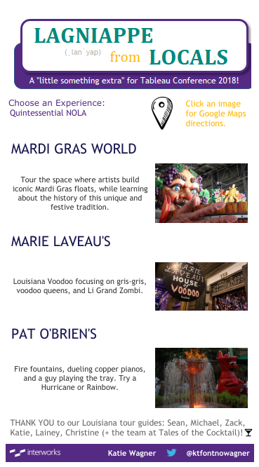 Katie: Hey Michael – thanks for the invitation to be here with you! I had so much fun building the NOLA viz. As soon as I heard the location announcement, my #1 goal was to ensure our #datafam loved Louisiana as much as I do. I knew that everyone would use sites like Google, Yelp, etc. for recommendations, so I wanted to give the audience a unique experience. I contacted a few friends who’ve lived in or heavily visited NOLA to create the list. I took ONLY local recommendations, thinking about the different travel vibes of our diverse community. I knew not everyone would be interested in drinking until 3:00 am, so I wanted to be sure to include things like coffee shops and live music. Having attended four conferences, I know that most people don’t lug around heavy laptops, so ensuring the viz was mobile friendly was another high priority.