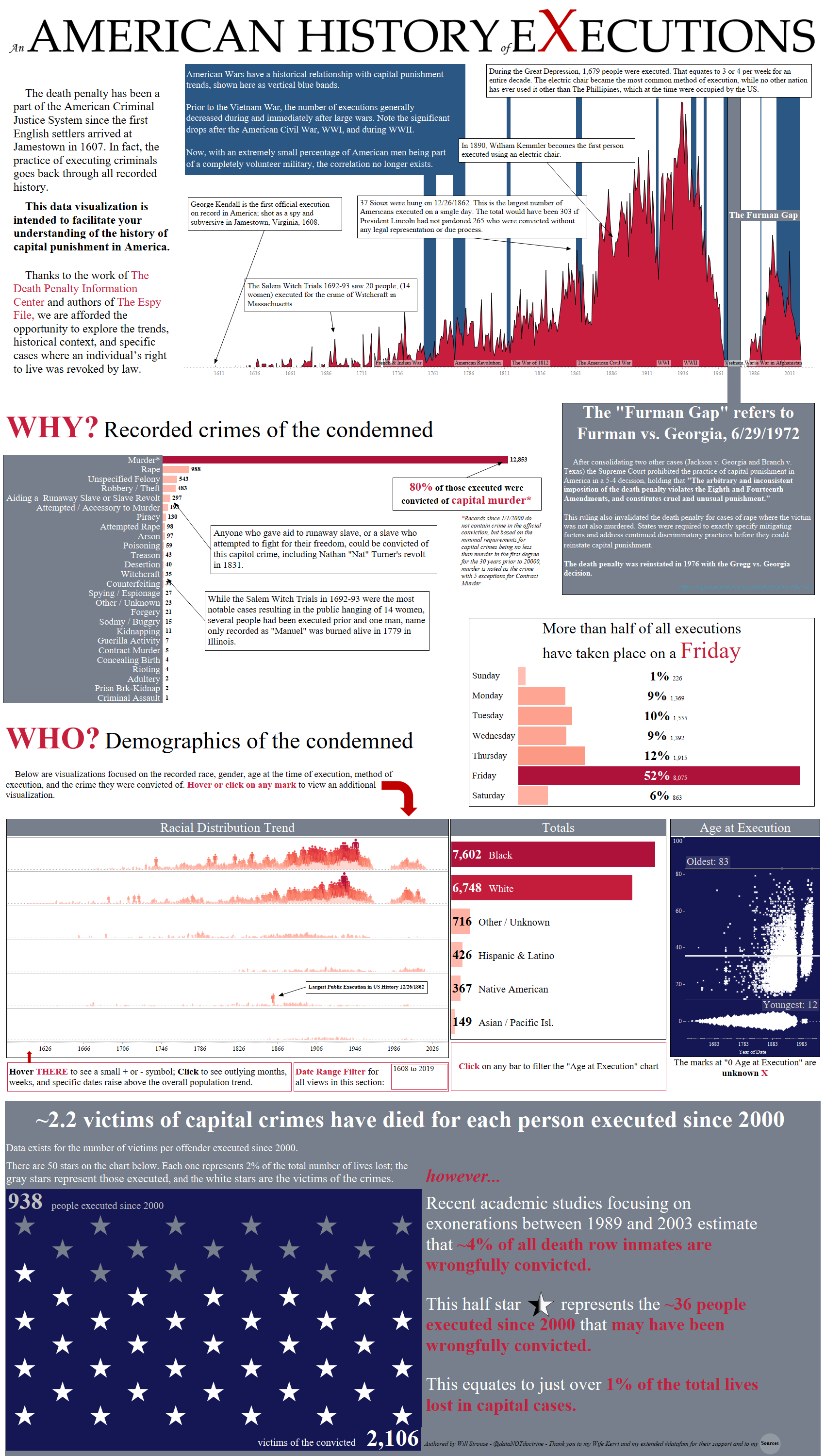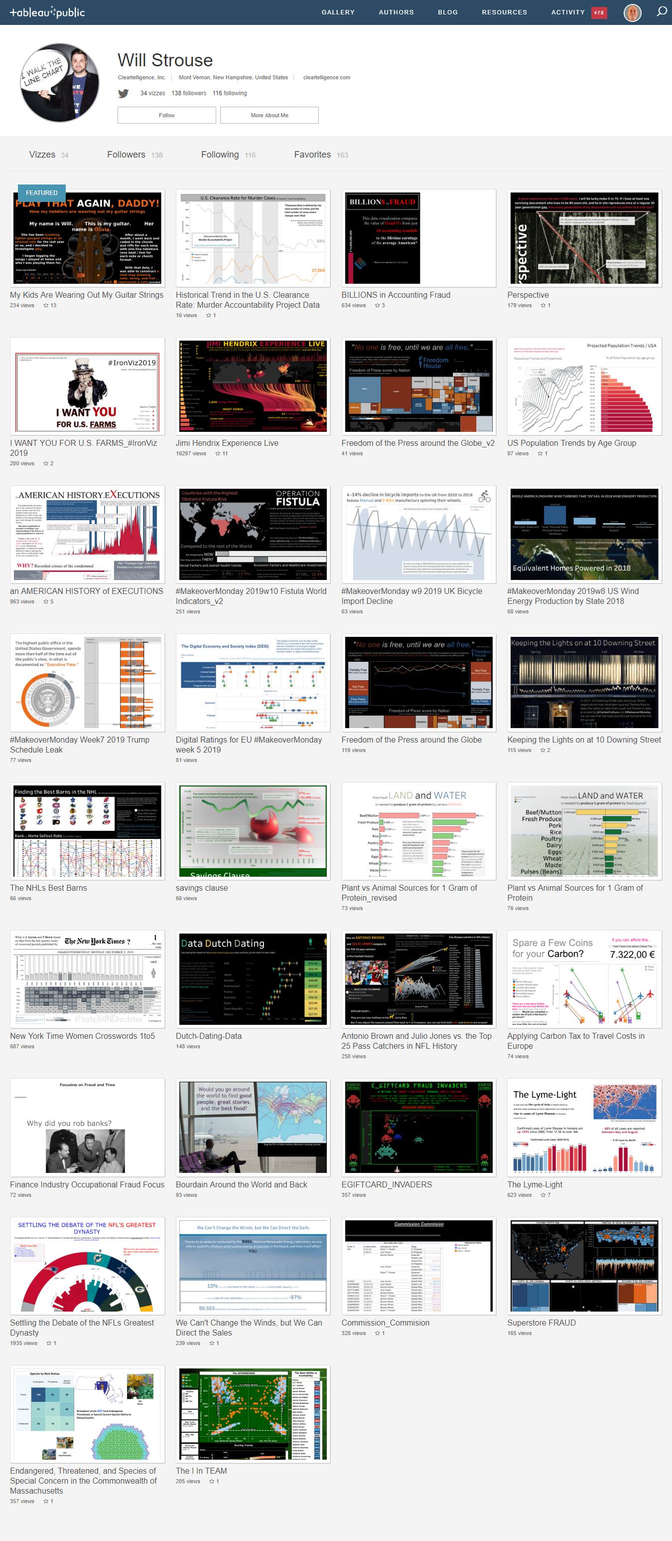 During this time, Will discovered the Tableau Community through the Boston Tableau User Group previously lead by Anthony Chamberas and Zack Leber. Over the next couple years, Will would present several times, including two keynote sessions on the Gamification of Interactive Fraud Dashboards and a data-art piece titled “An American History of Executions” which explores a data set containing every documented execution in the United States since 1600.