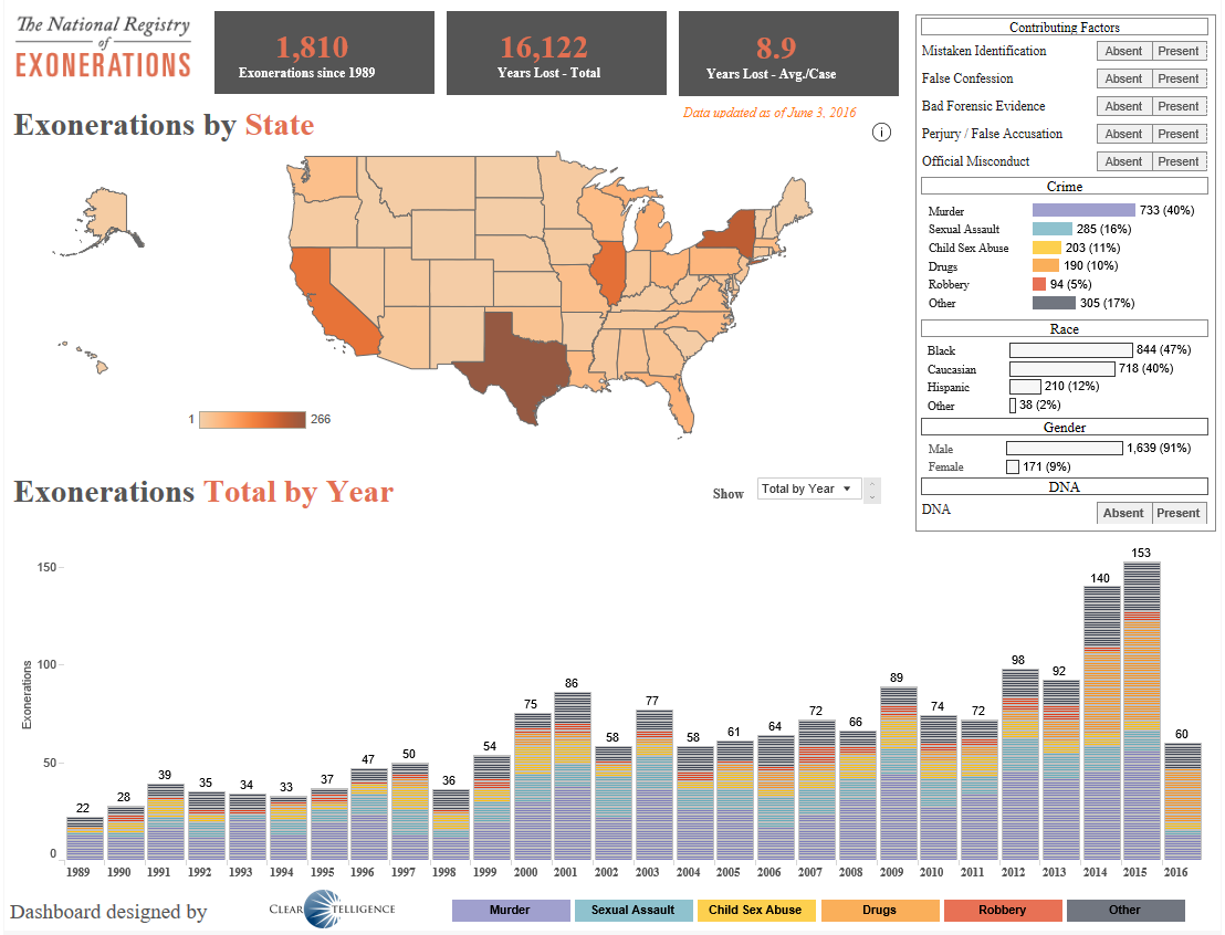 Link: https://public.tableau.com/profile/dustiboy21#!/vizhome/ExonerationDashboardv2/ExonerationsDashboard