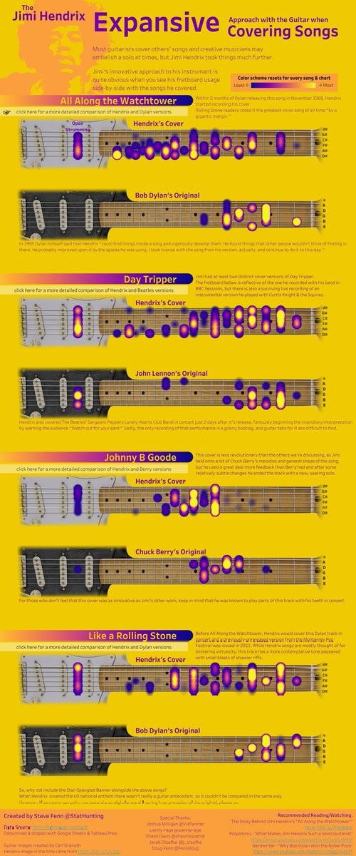 The last gut punch before I decided to quit was an entry from one of my favorite data artists, Steve Fenn. It was a viz more beautiful than I could have ever imagined. He built a series of fretboard heatmaps contrasting the playing style and complexity of several famous Jimi Hendrix covers against the original scores; and the heatmaps were over a cropped image of a Pearl White ’72 Telecaster Deluxe!