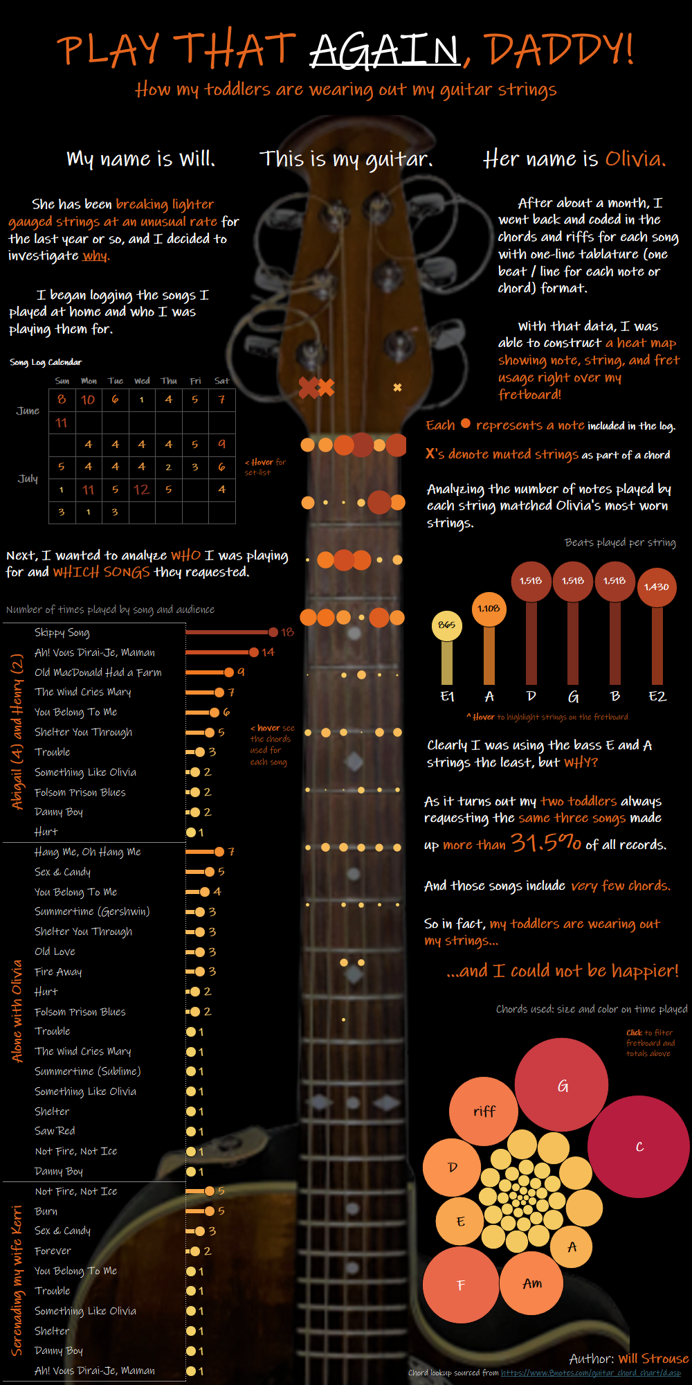 Michael: Hello Will. I have been a big fan of your work for some time. I was admiring your data visualization on Tableau Public, My Kids Are Wearing Out My Guitar Strings. Can you tell my readers the story behind this dataviz as it sounds very personal? Also, can you talk about your process to harvest the data, design the dataviz, and then create this dataviz in Tableau?