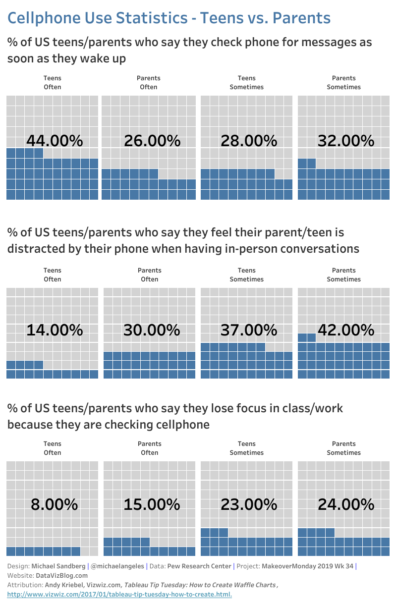 I first learned about Waffle Charts from Robert Kosara’s excellent web site, EagerEyes. Here is a link to Robert’s article on Waffle Charts and Understanding Pie Charts.