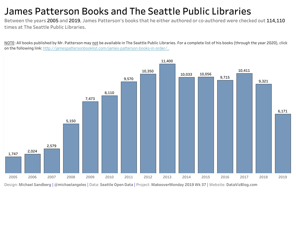 This week’s #MakeOverMonday is in the books (so to speak). I have not read any of James Patterson’s books, but he is a prolific author. I created a simple vertical bar chart. To help validate my data, I used a list of books written by Mr. Patterson to compare the data against, and included the link in the title of my workbook.